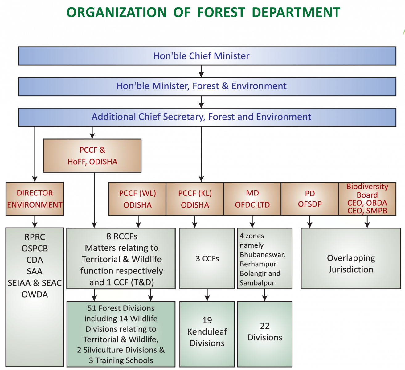 The Forest Department is headed by the Principal Chief Conservator of Forests (PCCF) & Head of Forest Force (HoFF). Broadly, the field organization of Territorial and Wildlife wings of Forest Department is as follows.